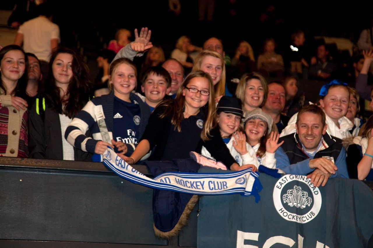 EG's discipline in the final was flawless with no cards.  That said, Surbiton went ahead in the 5th minute when former EG stalwart Ruth Gordon put the ball in the EG goal.  The advantage lasted less than 60 seconds however, as Lauren Workman equalised with a powerful shot from the edge of the circle.  Lauren was an EG Junior not long ago and is pictured below (wearing the Fly Emirates top) watching the EG Men secure an indoor title at Wembley in 2012.  Fabulous to see her - 12 years later having graduated from Loughborough - play a key role in the competition this year.