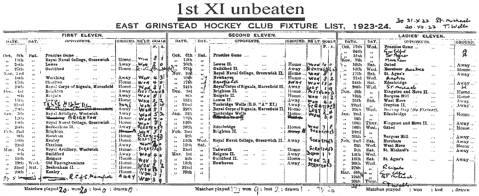 Notable achievements were a 15-0 defeat of RFA, a 14-1 win against Horsham, and an 8-1 trouncing for Brighton, thus punishing them for fielding an 'A' side. The Club are recorded as fielding a second XI for the first time on 31 December 1921. There is little record of the Club's performance in the following two seasons but 1923-24 is well documented. This should be no surprise since this was undoubtedly the high point of the Club's early history. The record for that year together with that of the Second XI, which was also outstanding, reads as follows: