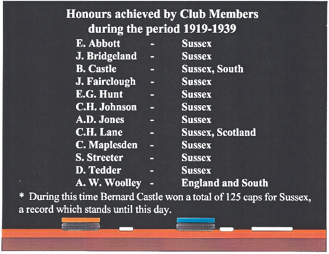 By 1934, Castle had obtained a record 105 caps for Sussex for whom C.A. Lane (subsequently a Scottish international) and C. Johnson were also playing. By 1933, .J Grayling, W.R. Barber, J.S. Robertson and E. Winnington Ingram had joined the premier side. The last named, an Oxford Blue, was apparently a talented right wing. D. Tedder also rejoined after a period in Australia. In 1933, Leslie Davis took over as Hon. Secretary from H. Osborne and held this post until 1955. In the same year C.H. Johnson resumed the role of 1st XI Captain for a single season but he returned again in 1937 for what proved to be the final two seasons before the Second World War.